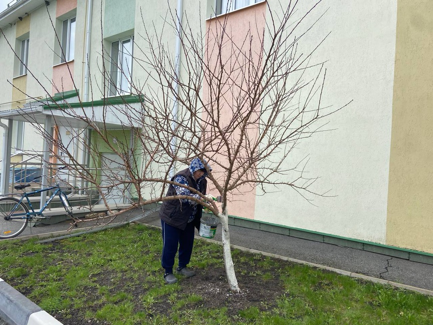 За один день команда активно поработала: навели порядок на прилегающей к зданию территории, убрали мусор, привели в порядок клумбы и газоны. Особое внимание уделили деревьям — их обрезали, а стволы покрасили известковым раствором, чтобы защитить от зимних повреждений и вредителей.